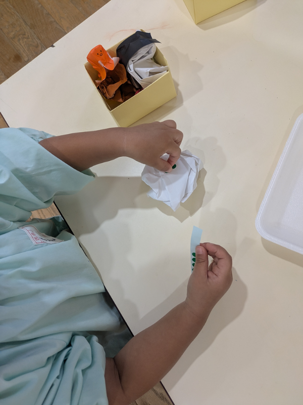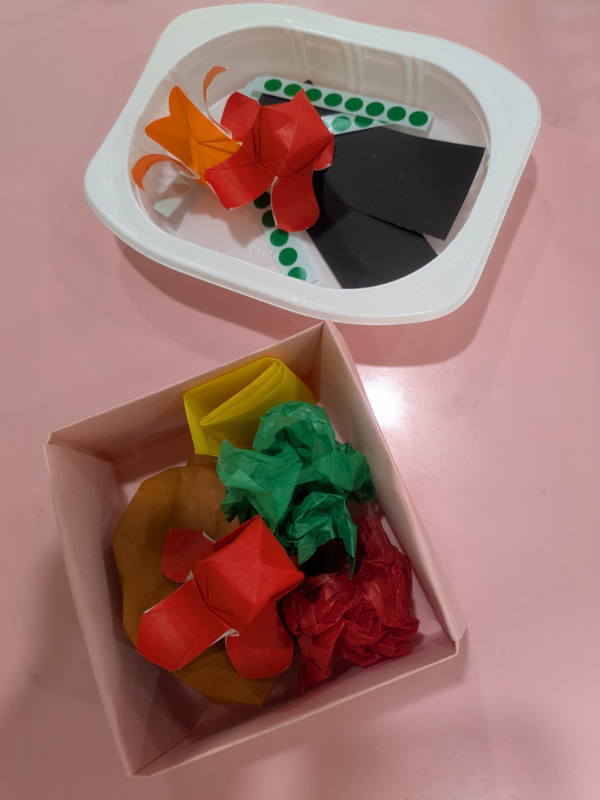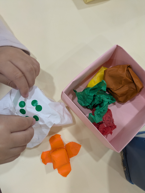 紙をまるめたり、ギュッとしたりして、ハンバーグや卵焼き、ブロッコリー、ごはんはシールをはってグリンピースごはんになりました。先生からタコさんウインナーをもらってお弁当箱につめてとってもじょうずにかわいいお弁当ができあがりました!