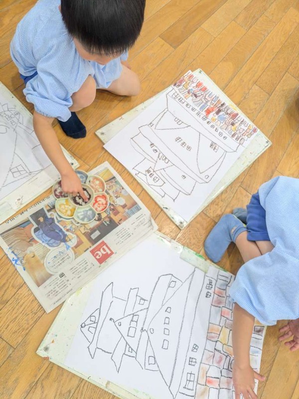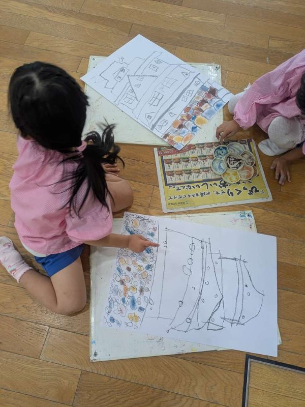 パステルカラーを削って粉にして指で色付けをしているクラスや